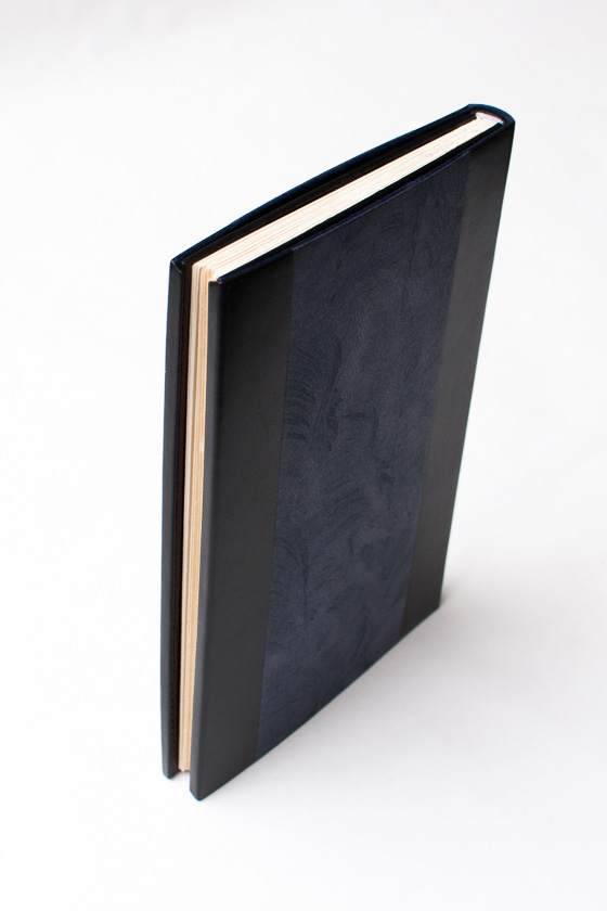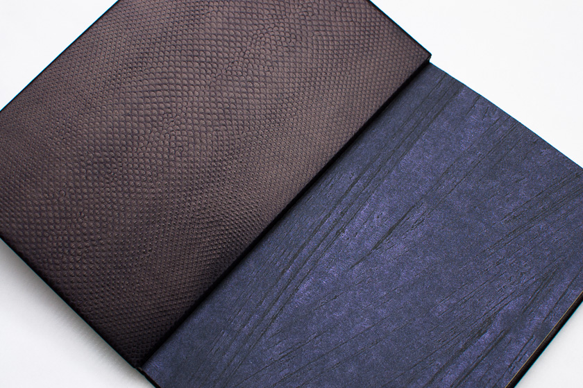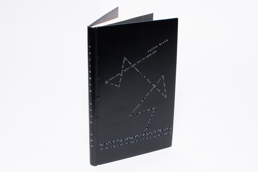 - Passé-carton plein cuir en box noir, gardes doublées en serpent d'eau noir violet, gardes volantes en papier en monotype, tranchefiles brodées, incrustation de perles en verre sur la couverture, étui et chemise assortis, titrages en dorure manuelle