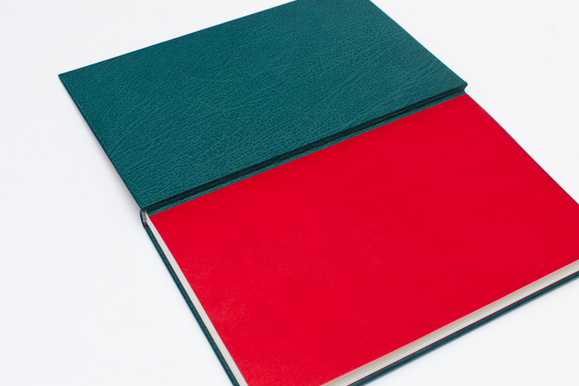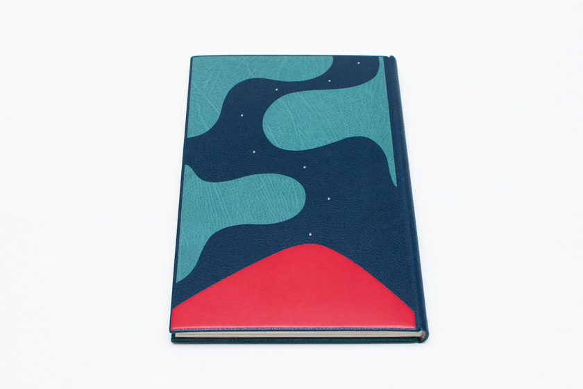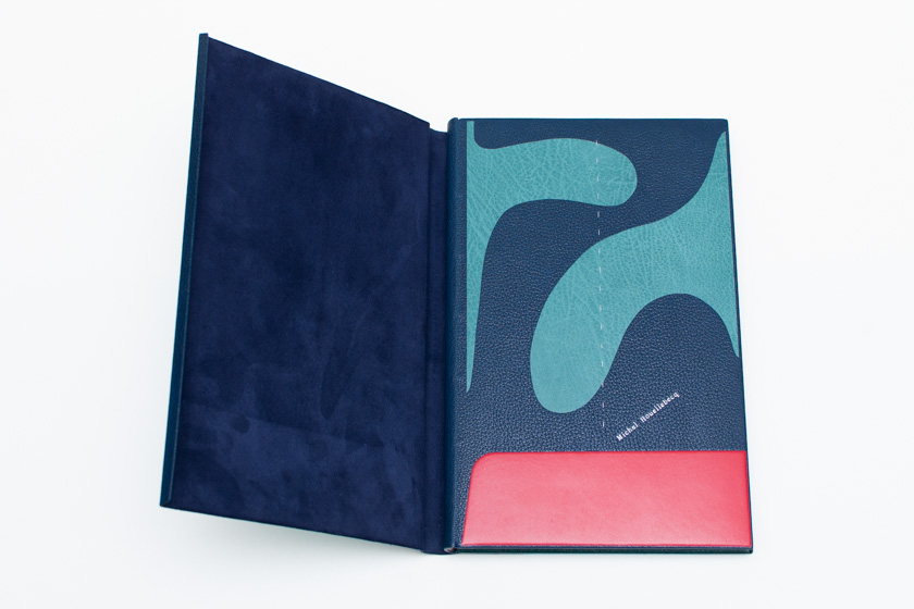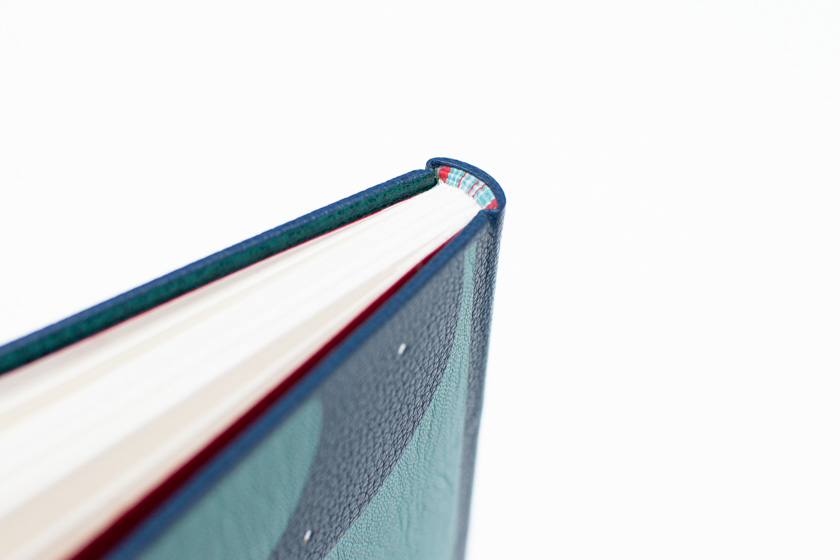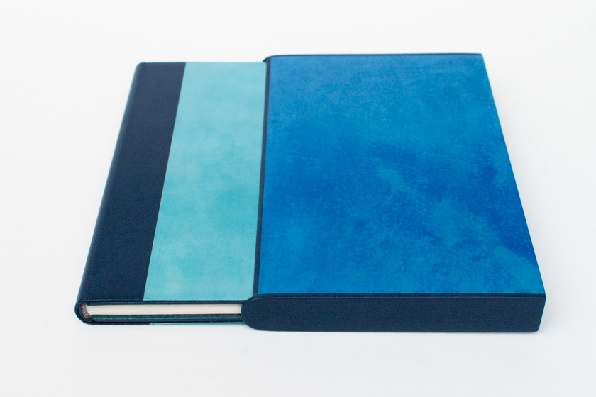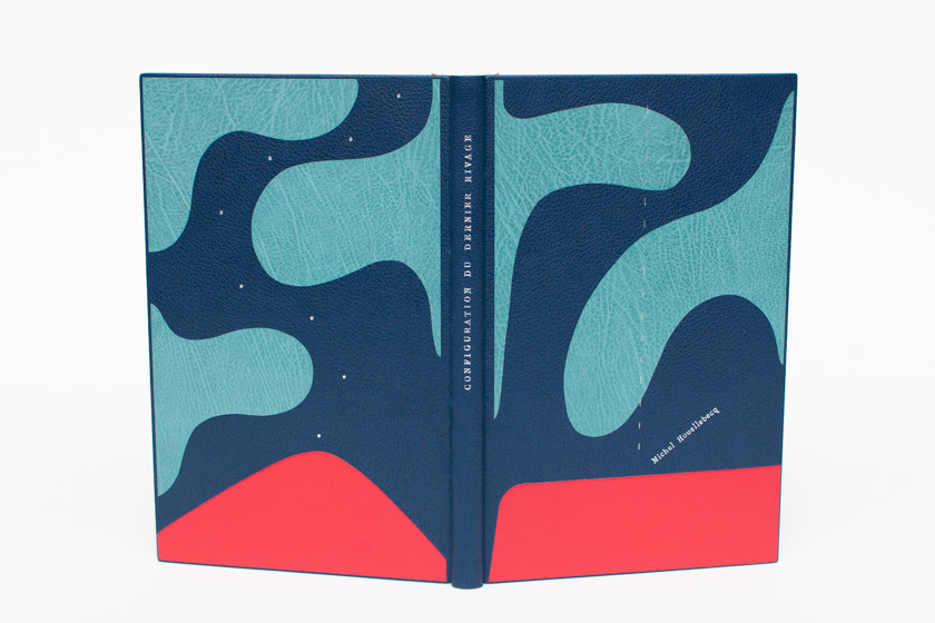 - Passé-carton plein cuir en chagrin bleu marin, doublé en chèvre d'oasis, gardes volantes en papier japon teinté, mosaïque de cuir en relief et en incrustation à niveau, titrages et décoration en dorure manuelle, tranchefiles brodées, étui et chemise assortis