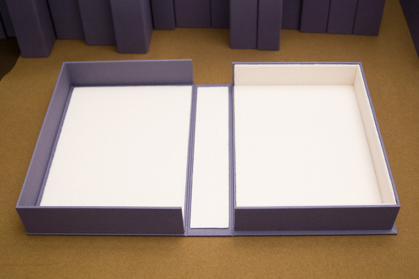 Home Works Restauration des livres Boîte de conservation Techniques reliure Boîte de conservation cartonnée et entoilée, garnissage à l'intérieur en molleton (ou papier non acide), étiquette de titre sur le dos Dimensions adaptées sur-mesure à chaque contenu